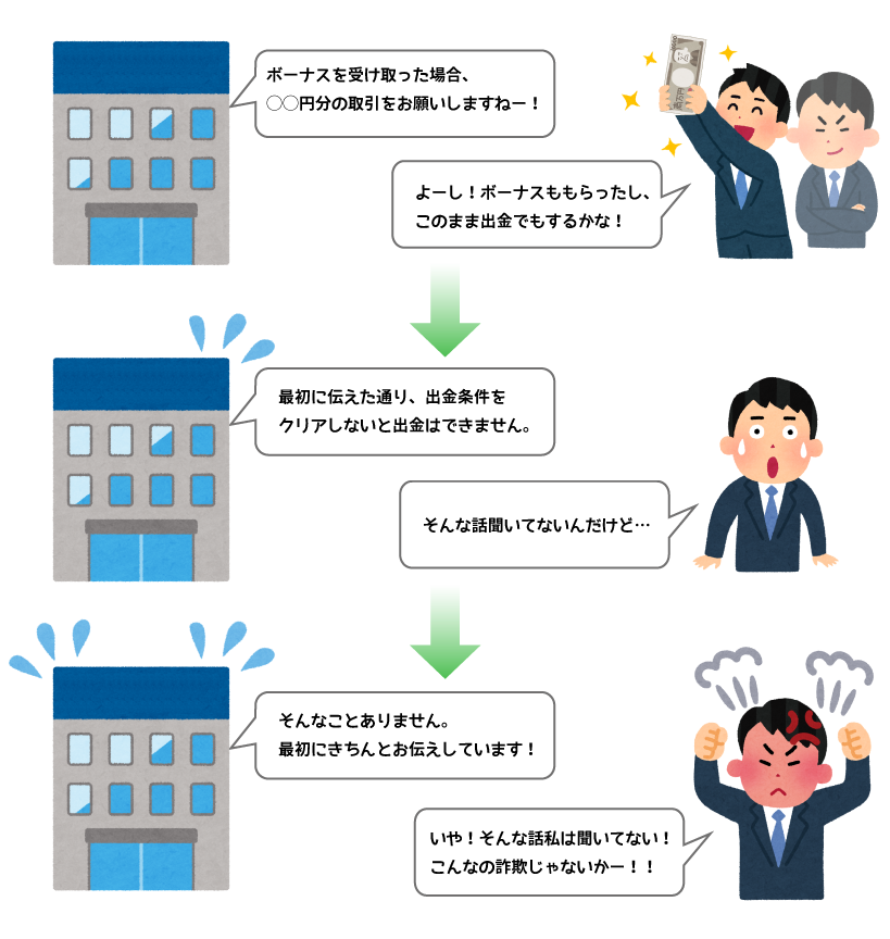 業者側は最初からボーナスを受け取った場合はそのまま出金ができないように、最低◯◯円分の取引をすることを条件としています。