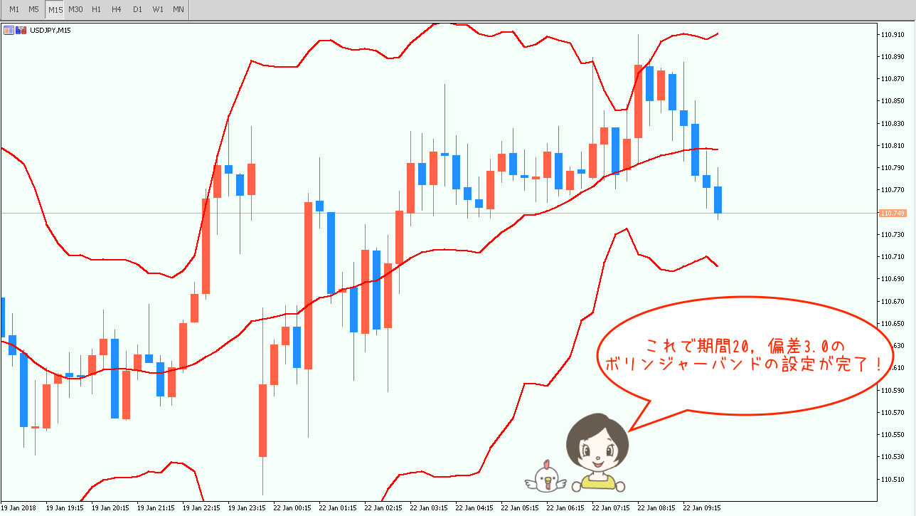 これで期間20、偏差3σのボリンジャーバンドの表示ができました^^