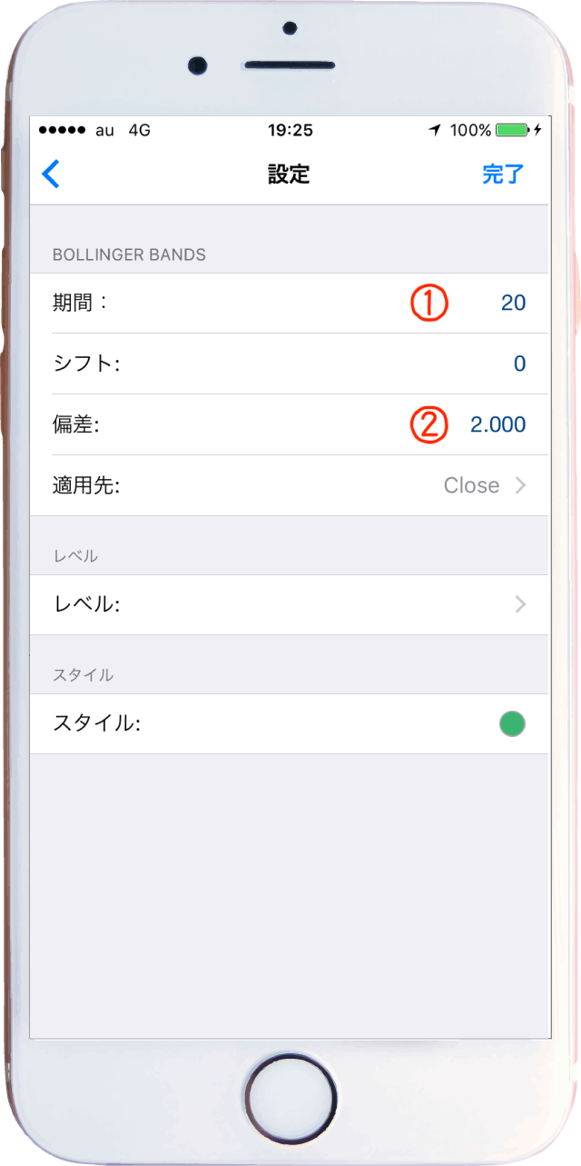 設定が終わったら右上の「完了」タップでボリンジャーバンドの設定完了!😆