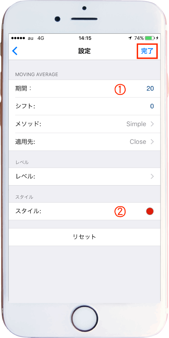 設定が終わったら右上の「完了」タップでボリンジャーバンドの設定は完了!😆