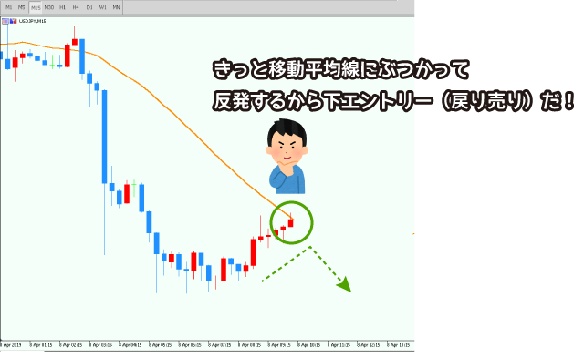 押し目買い・戻り売りをする際はローソク足が移動平均線付近で反発後、トレンド方向に進行したことを確認してからエントリーに臨みましょう(*´∀`*)