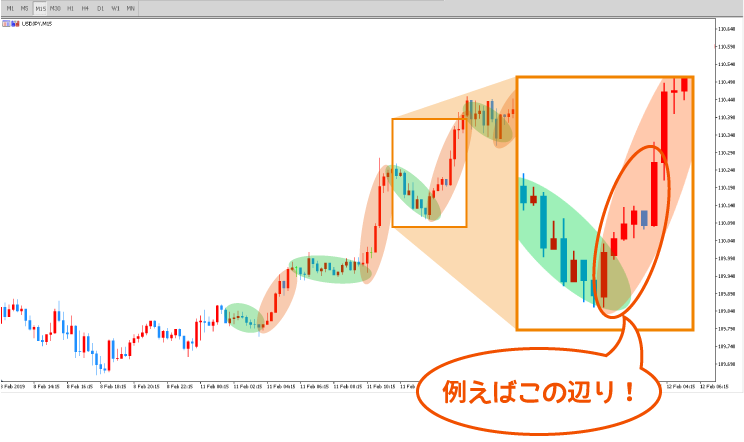「トレンドは上だから上にエントリーだ!」と息巻いて上エントリーした直後に戻しが入って負け、なんてことも容易に想像ができます(^_^;)