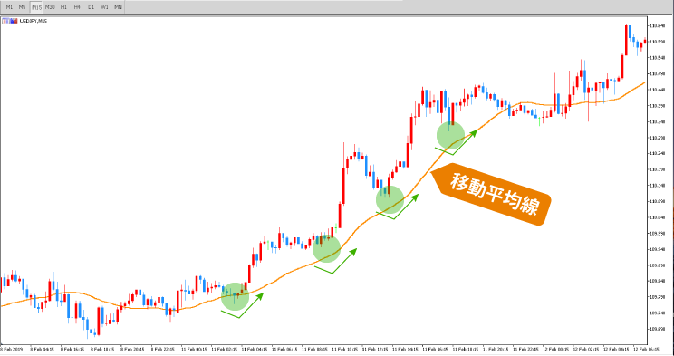これは先ほどまでのチャートに移動平均線を1本表示させた画像ですが、ローソク足が移動平均線の近くに来たところで反発し、上昇しているのがわかるでしょうか^^?