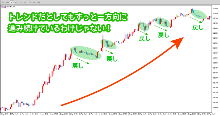 先ほど冒頭でもお話したとおり、トレンド相場は一定間隔で“戻し”を挟みながらジグザグして進んでいきます😀