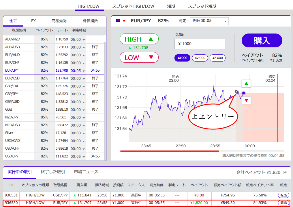 さすがに指標以外何の根拠もないトレードなので、リスクを考慮して取引金額は最低の1,000円でエントリーしました(笑)