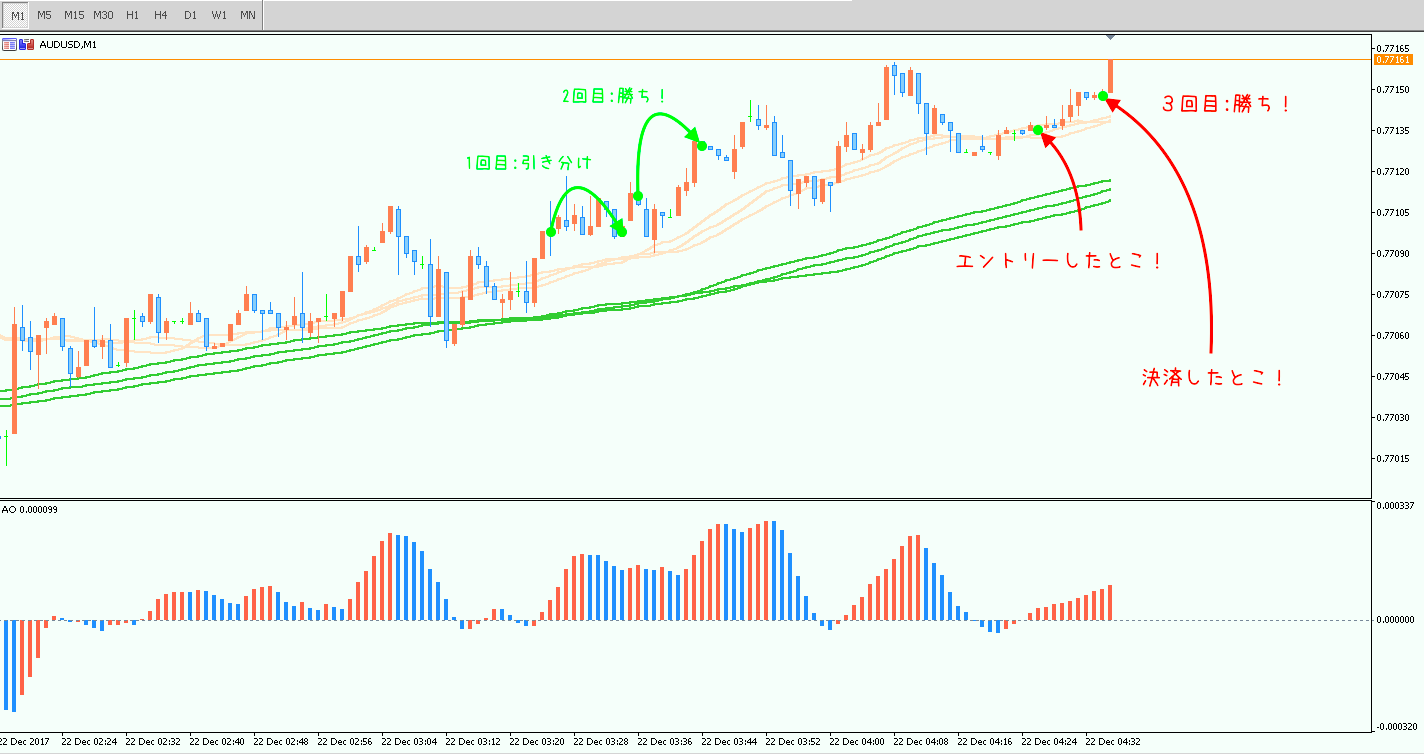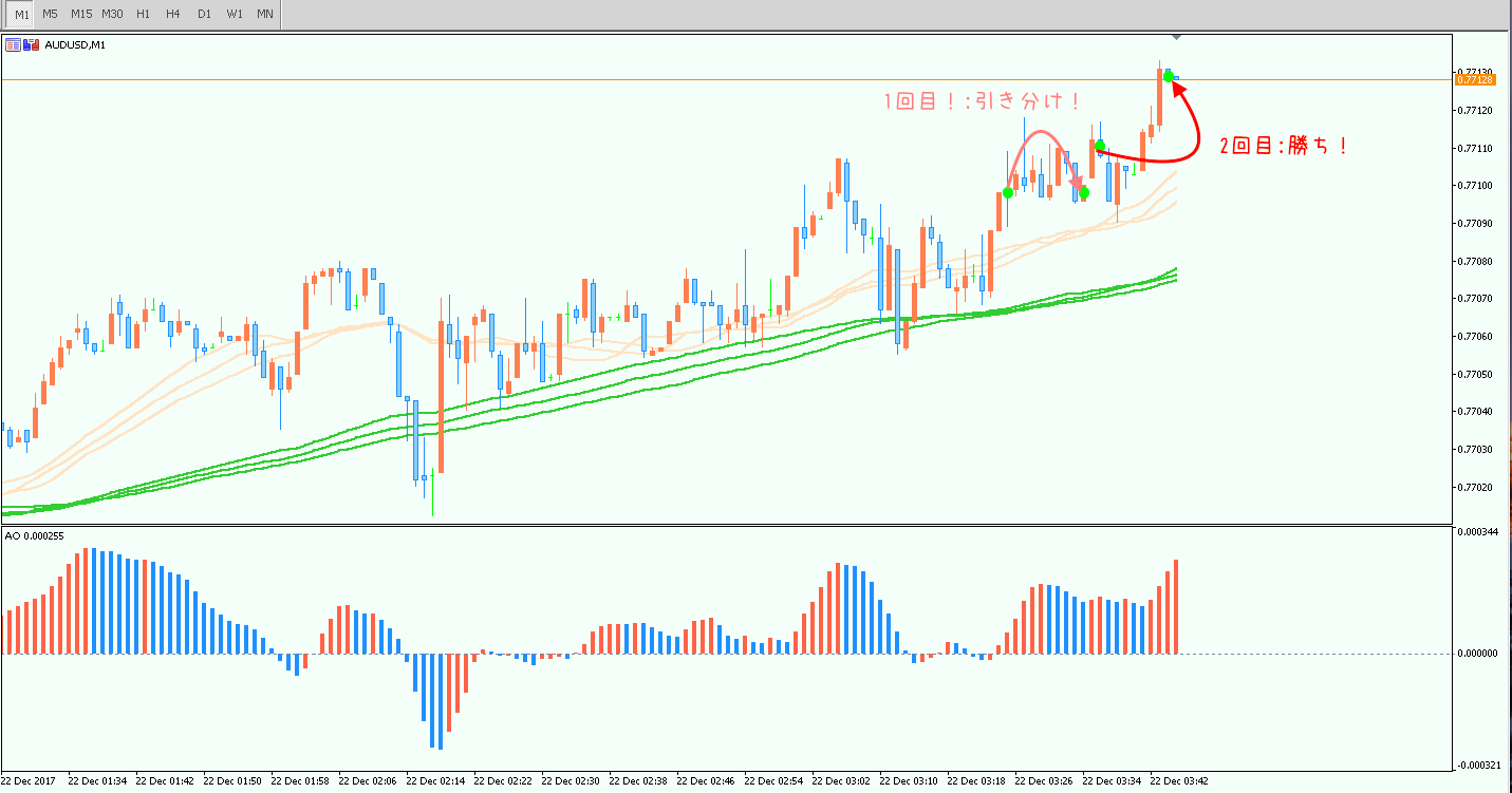 - ③1分足で15分足と5分足との矛盾がないか確認しタイミングを計ってエントリー!