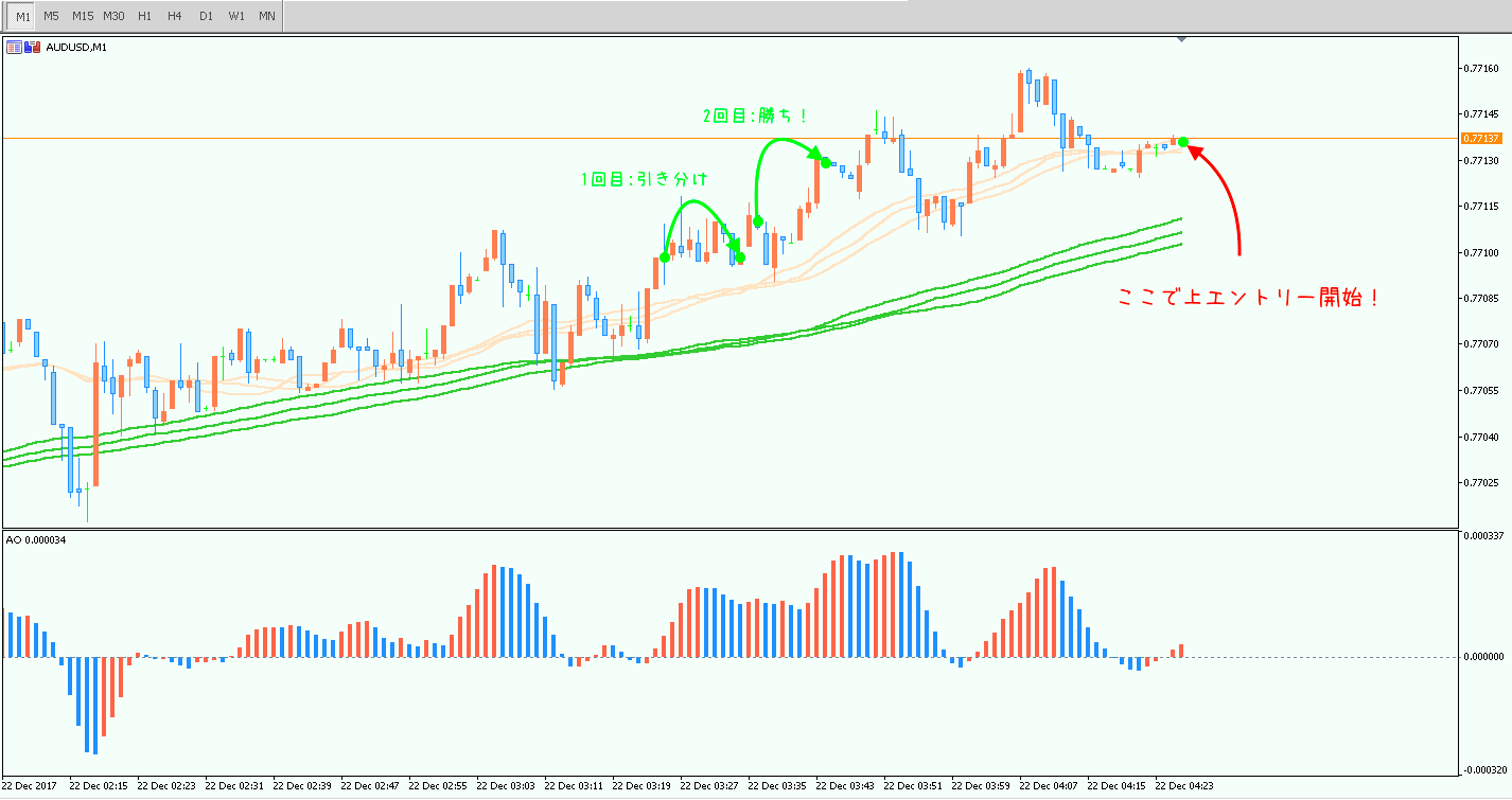 あとは1分足で上位足との矛盾がないかチェックできたら、タイミングを計って連続エントリー開始です!