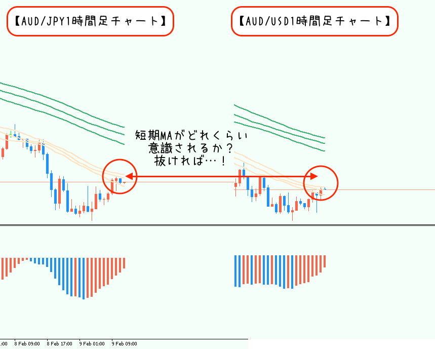 1時間足ではちょうど短期MAにぶつかっている状態。