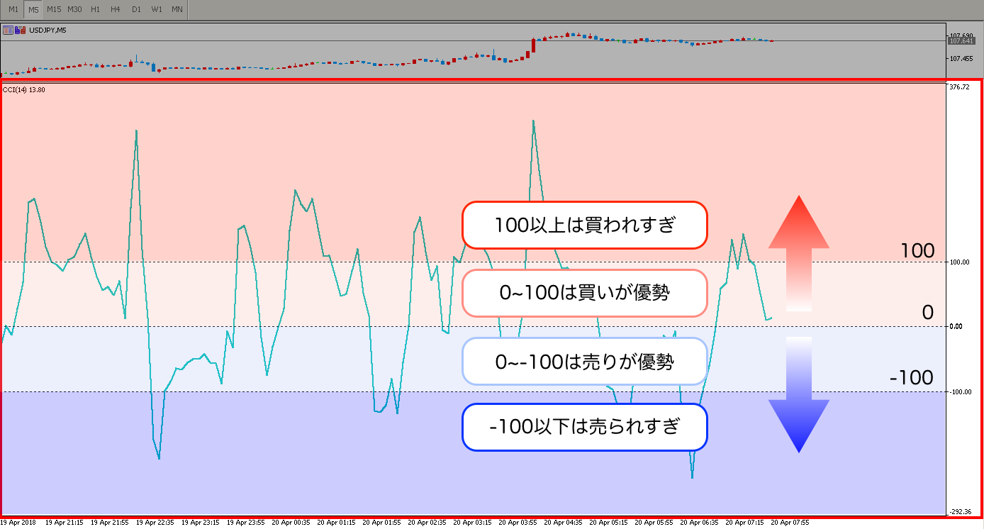 CCIが買われすぎゾーンに推移していれば今の相場は買われすぎているからこれから売られる=下がる可能性が高い!と判断し、売られすぎゾーンなら今の相場は売られすぎているからこれから買われる=上がる可能性が高い!と判断される傾向があります💡