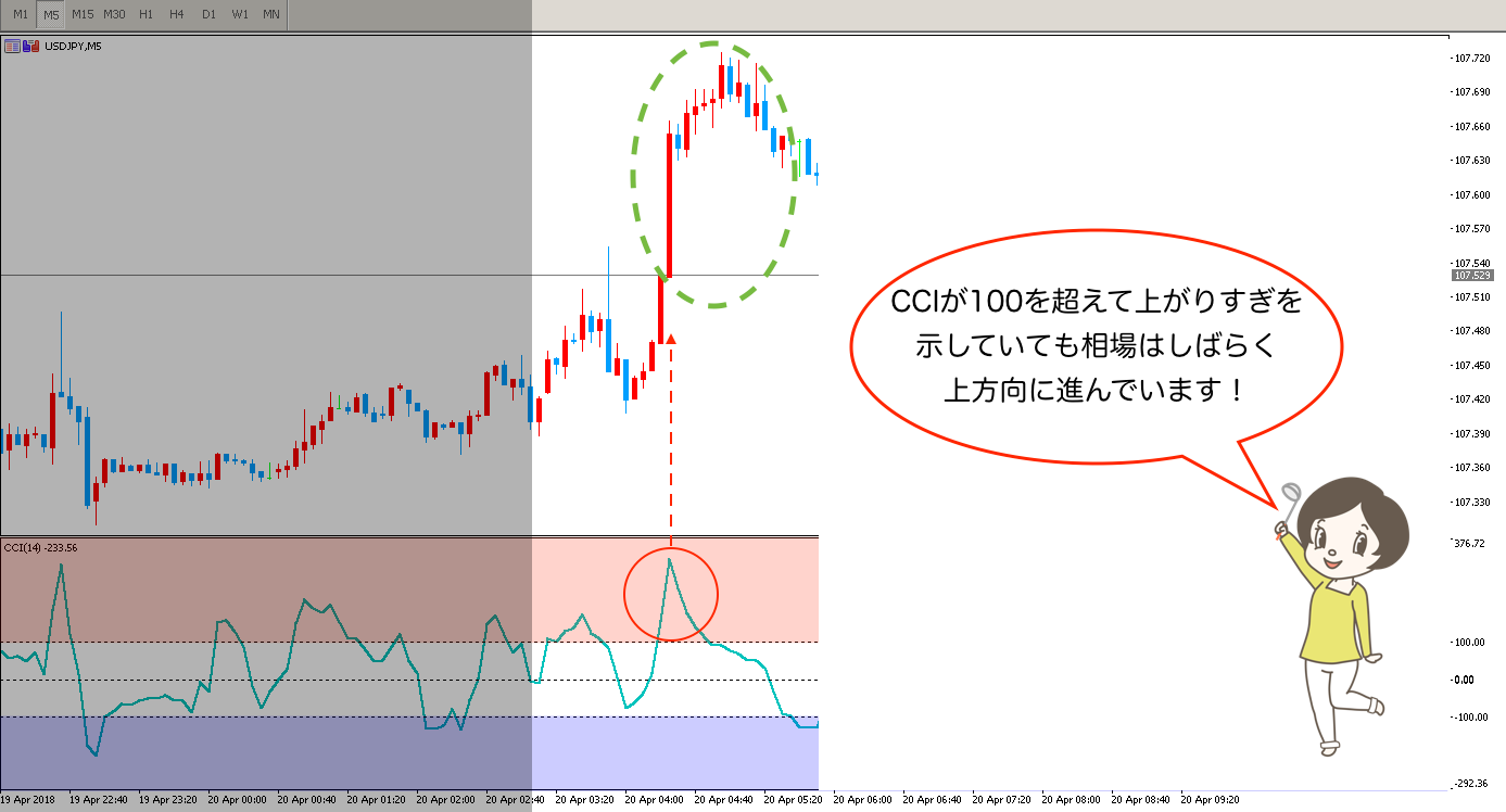 ここまでお話したようにCCIが±100を超えると価格が上がり(下がり)すぎと一般的に判断されますが、相場によってはそう思わないトレーダーも多く、そのままトレンド化することもあります。