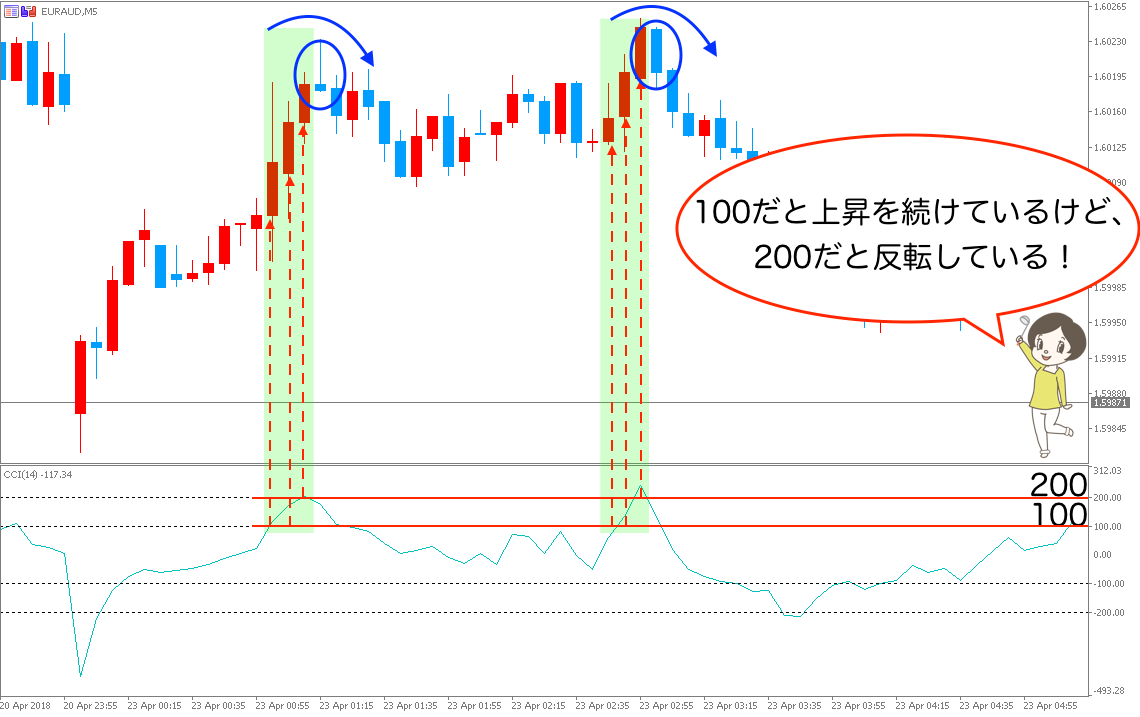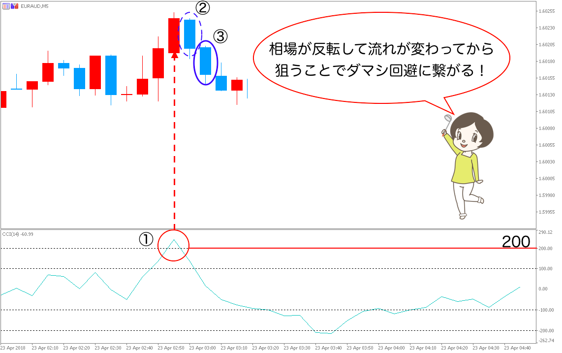 • ②CCIが±200を超え、相場が反転して流れが変わったのを確認してから狙う!