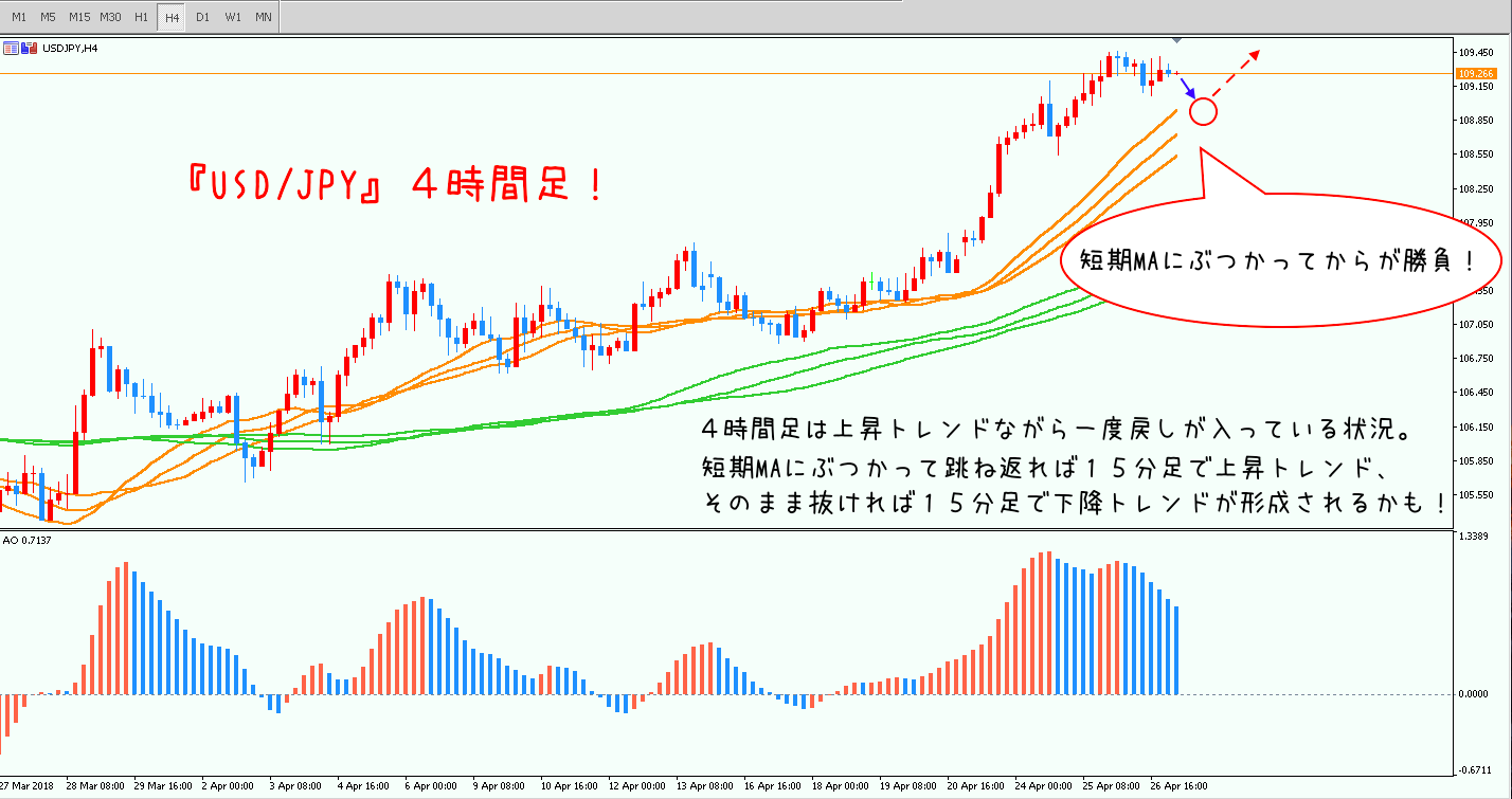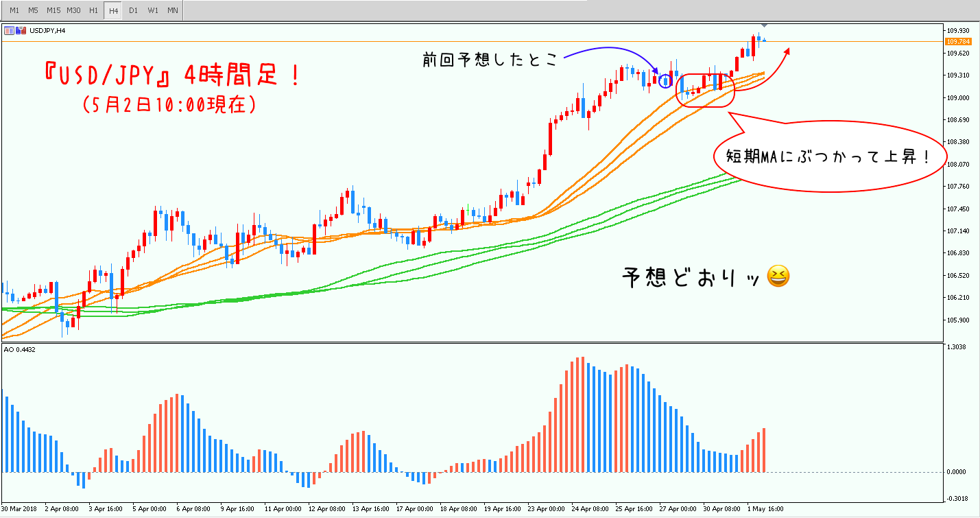 USD/JPYは「4時間足の短期MAにぶつかってからが勝負」というお話をしていましたね^^