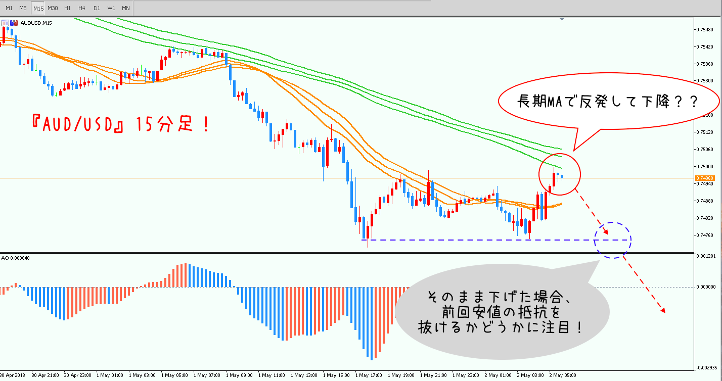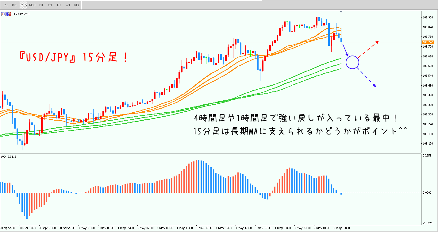 このままだと1時間足、あるいは4時間足の短期MAまで戻しが入る可能性も考えられますが、目先は15分足が長期MAにぶつかったときに上昇するかそのまま下抜けるかが重要なポイントになるかなと思います(^_^)