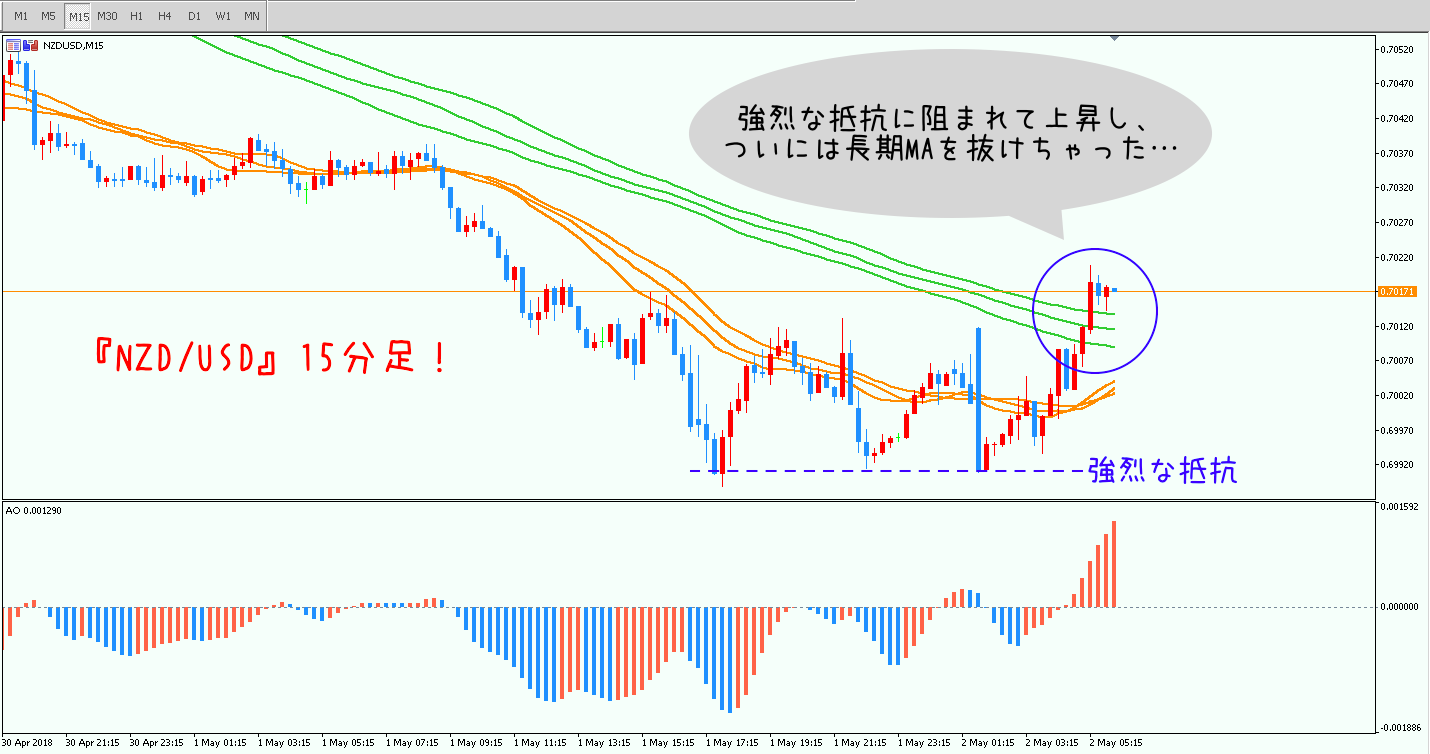 15分足の進む方向と矛盾はなく、綺麗に下方向を目指してますね^^