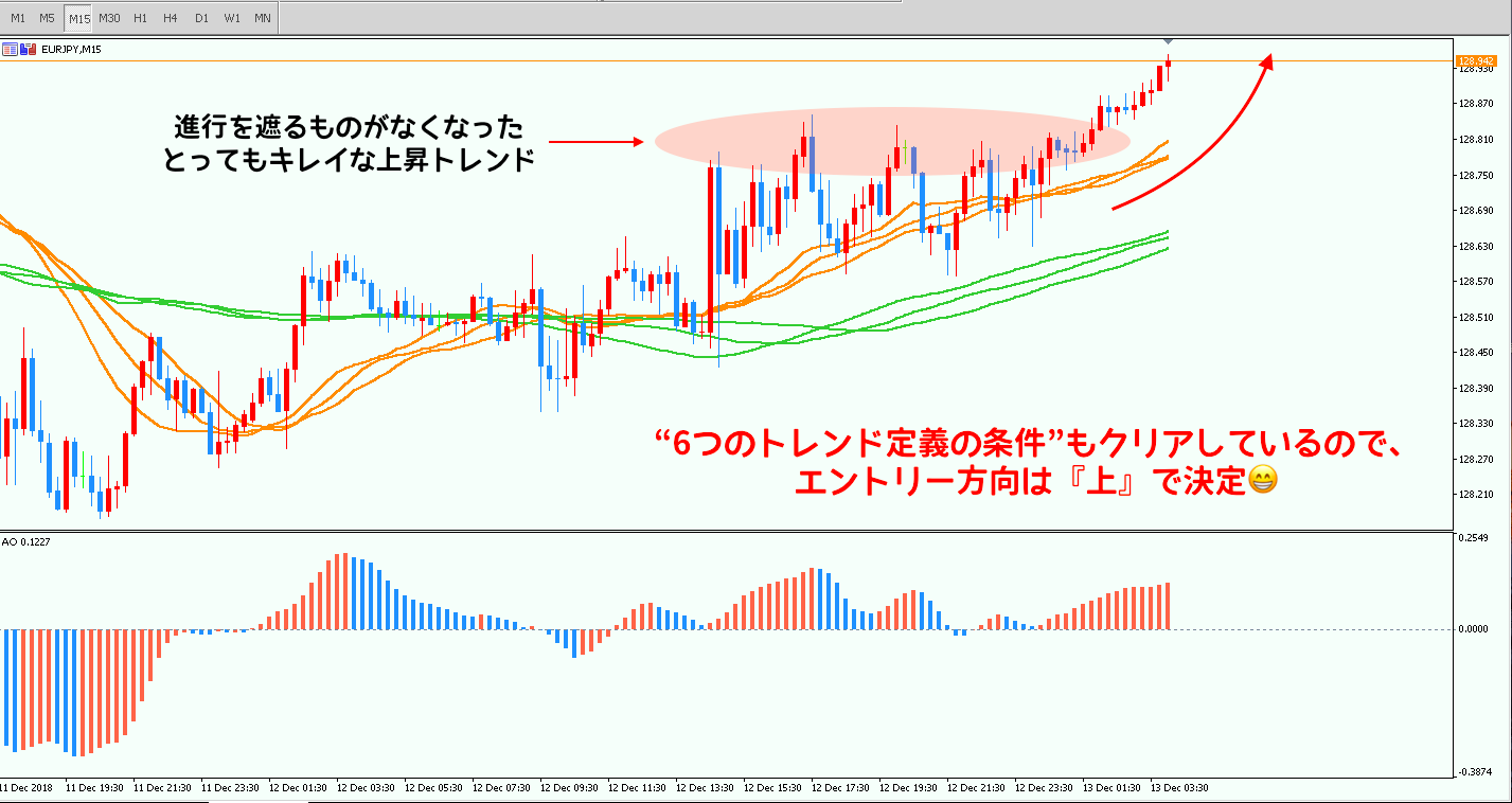 先ほどと同じくトレンド定義の条件をサクッと確認し、15分足の相場状況と矛盾がなければこの時点で大方エントリーポイントは決まります(*´∀`*)