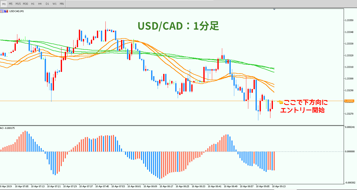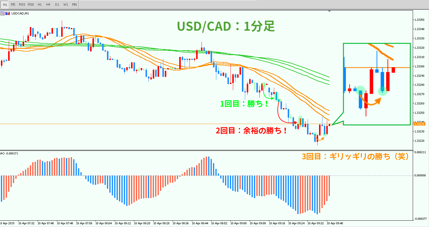 - ③1分足で15分足と5分足との矛盾がないか確認しタイミングを計ってエントリー!