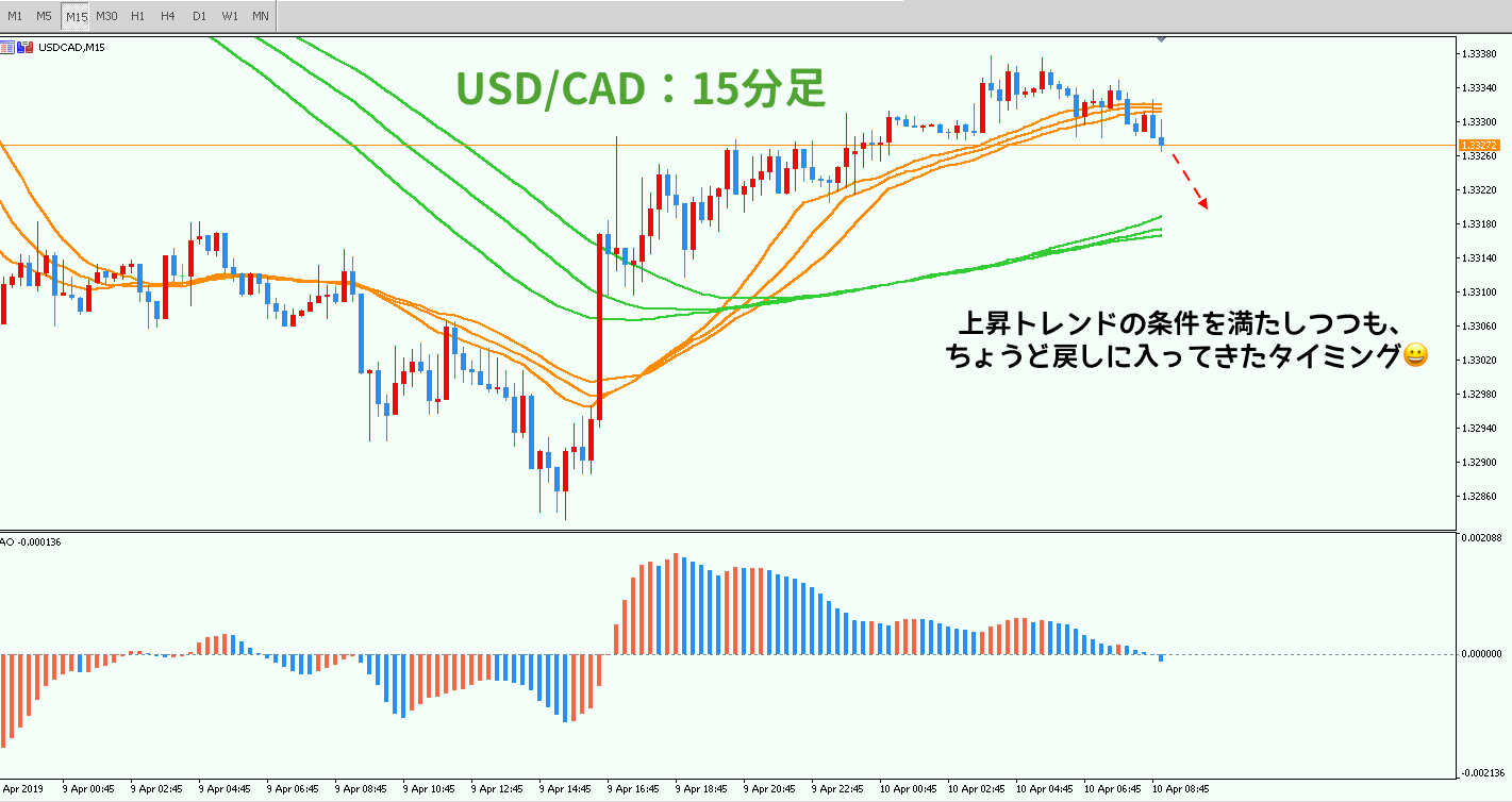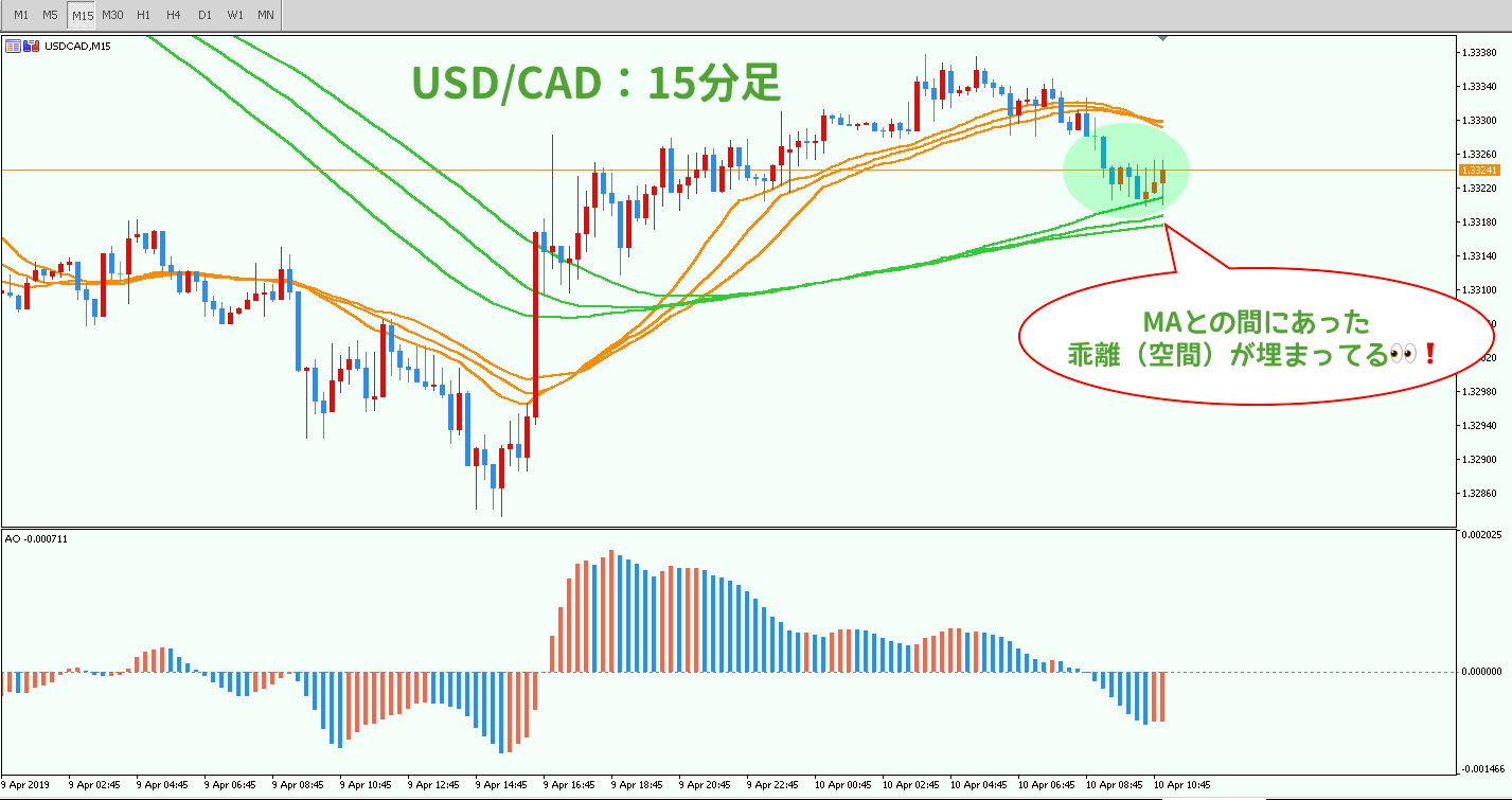 そう、今回私が狙ったのはこの15分足がMAに向かって戻していく際の値動き=『戻し』です(*´∀`*)