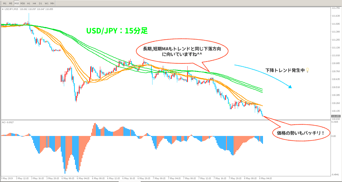上位足である15分足と下位足である5分足で方向性が合致したので、ドル/円の通貨ペアは下落傾向にあると判断!