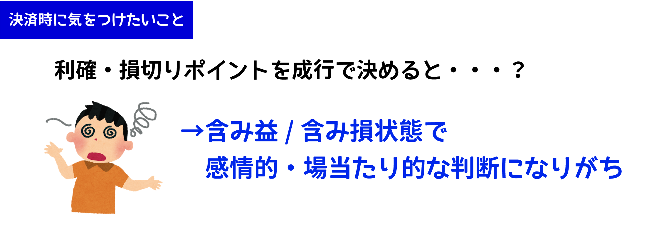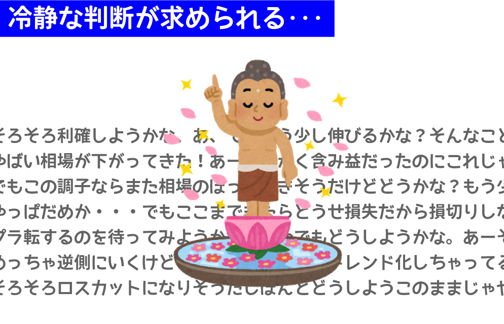 含み損状態のときはできるだけ損失を小さくして損切りしたい、なんならプラ転してくれないかな、といった願いの中で更に含み損が大きくなってしまう可能性もあります。