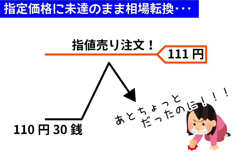 例えばドル円相場で現在110円30銭のときに111円で売りを入れる指値注文を設定していたとして、相場が110円99銭まで上って折り返してしまった場合は指定価格に到達していないので注文は出されません。