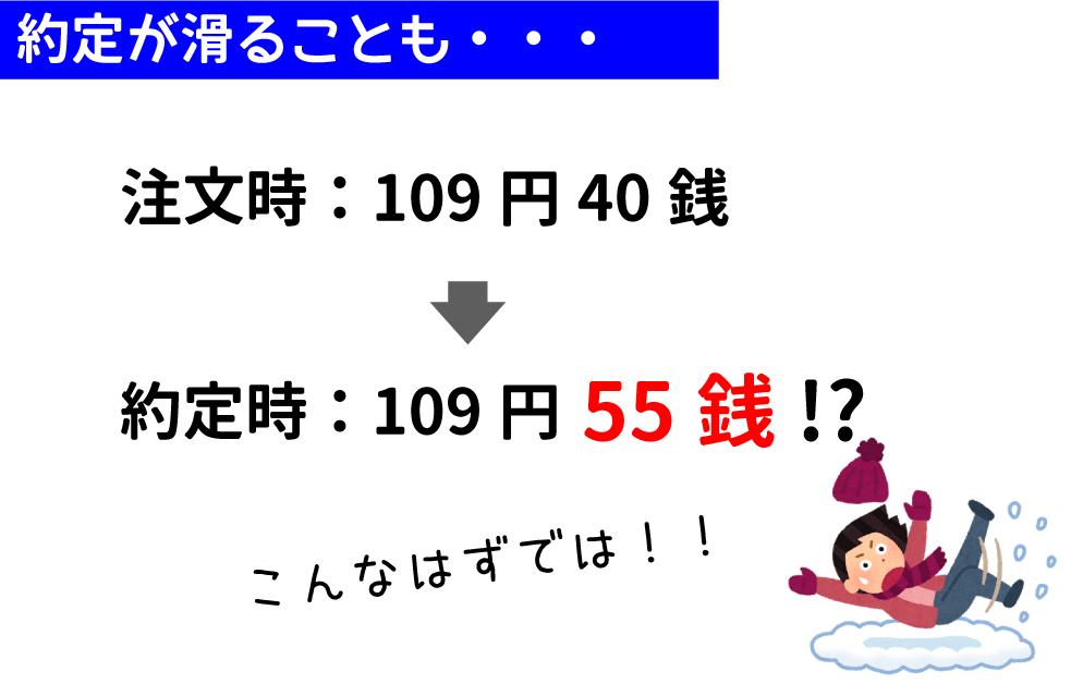 - 値動きが激しいときには価格がスベって約定することがある