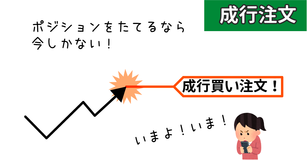成行注文とは、例えばチャートを見ていて相場が上がりそうな素振りを見せている中で取引注文を現在価格で出すこと注文方法です。
