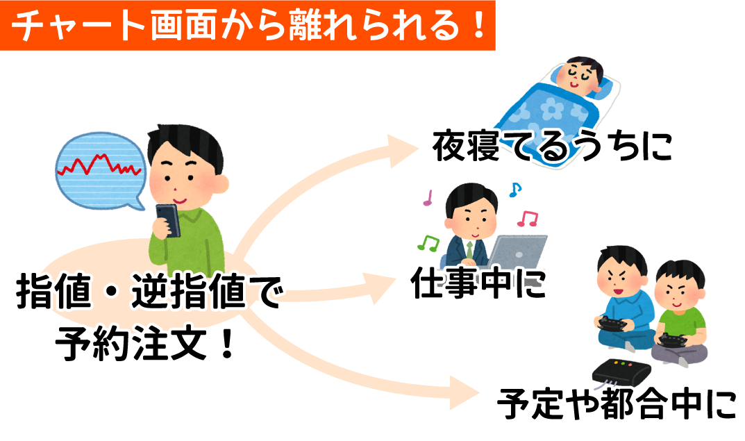 指値・逆指値を設定しておけば為替値が指定した価格に指さったタイミングで注文が出され約定されたり、決済されるので、常にチャートを見ることができない忙しい方や、用事があるときなどに有効な注文方法です。
