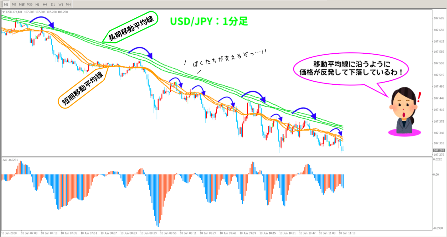 ②そして移動平均線が抵抗帯として機能していることで、より継続しやすい状態になっている相場環境。