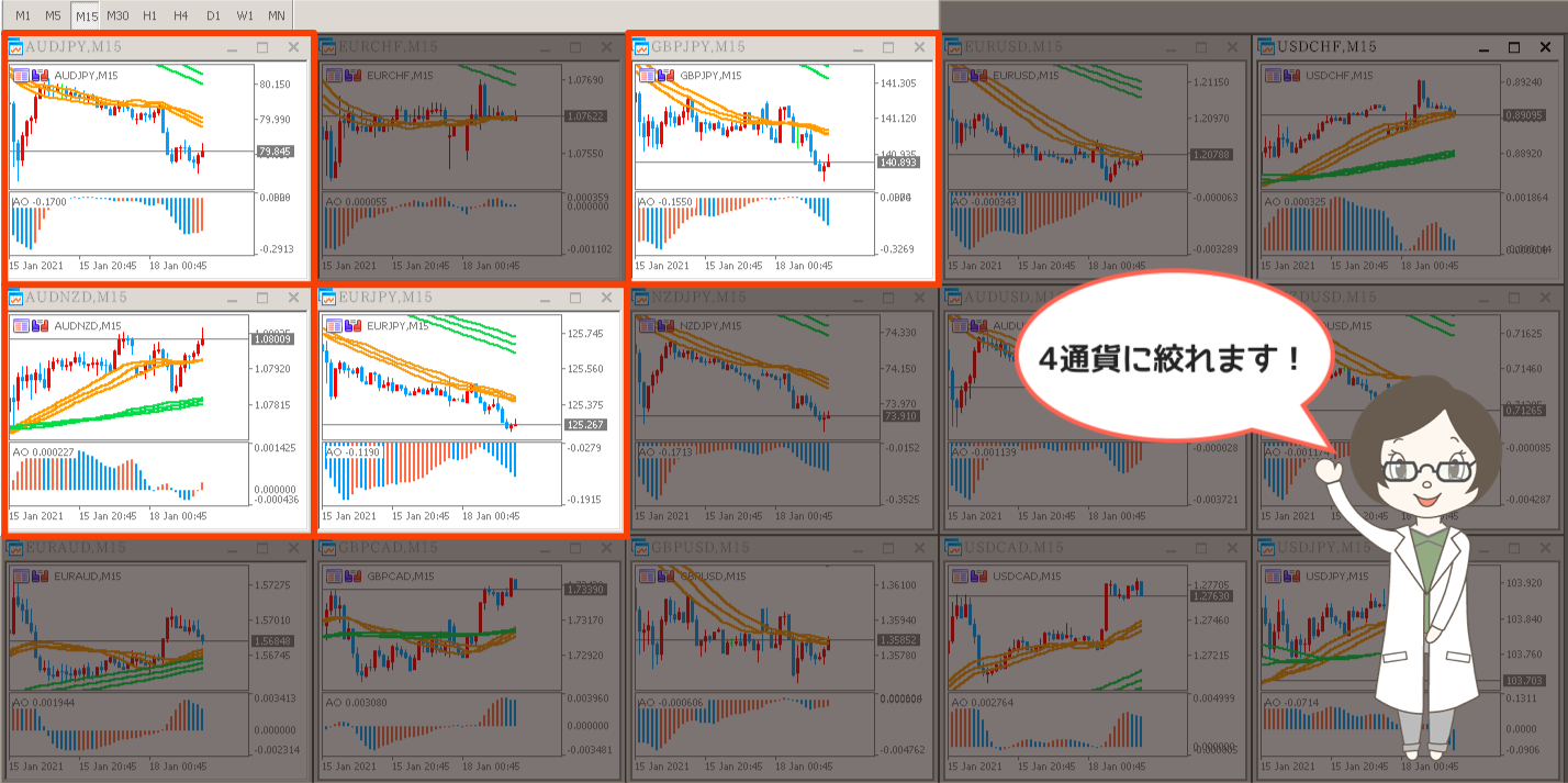 このようにチャンスが減ってしまう反面、監視する通貨ペアは約半分まで減らすことができるため、それだけチャート分析にかける時間も分析にかける労力も少なくて済みます😊