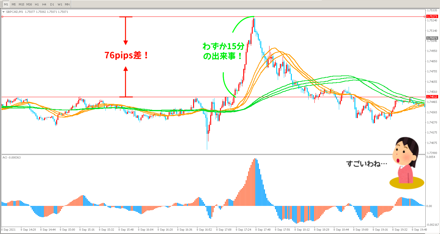 午前中のわずか15分ほどでぐーーっと凄い勢いで上昇曲線を描き、なんと70pips以上も上昇(゚∀゚)