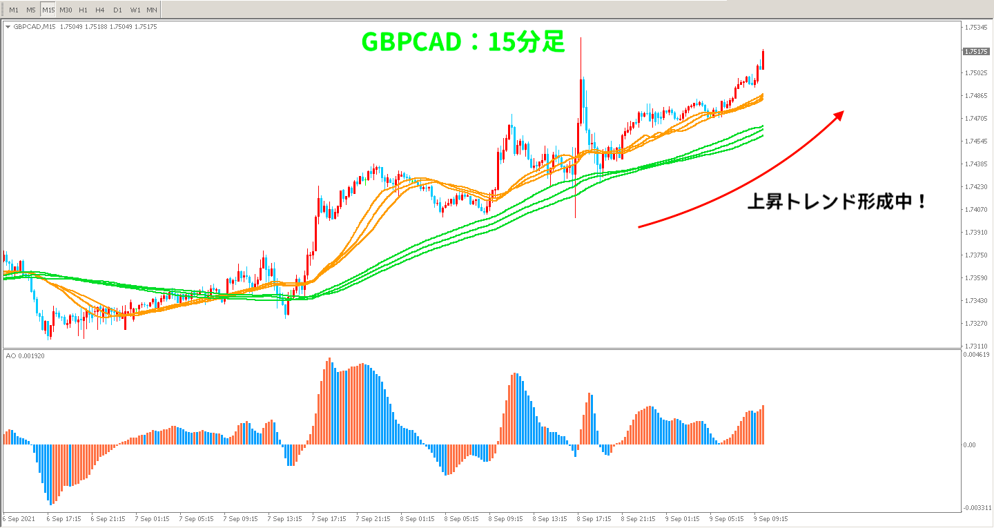 まずは15分足でエントリーを狙う相場状況を把握し、エントリー方向を決定します😊