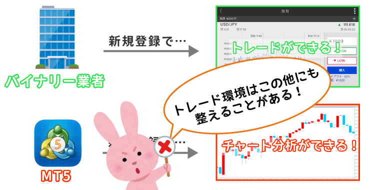 しかしながら、多くの人はトレード環境=トレードできる環境と認識してしまっていて、無料ツールのMT5と新規登録したバイナリー業者の口座さえ揃えばあとは勝率の高い手法のみ!なんて突き進んでしまいがち^^;