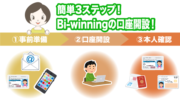 Bi-winningでは「①メールアドレス②電話番号③本人確認書類」の3つを予め用意しておくと、スムーズに口座開設を進めることができます💡